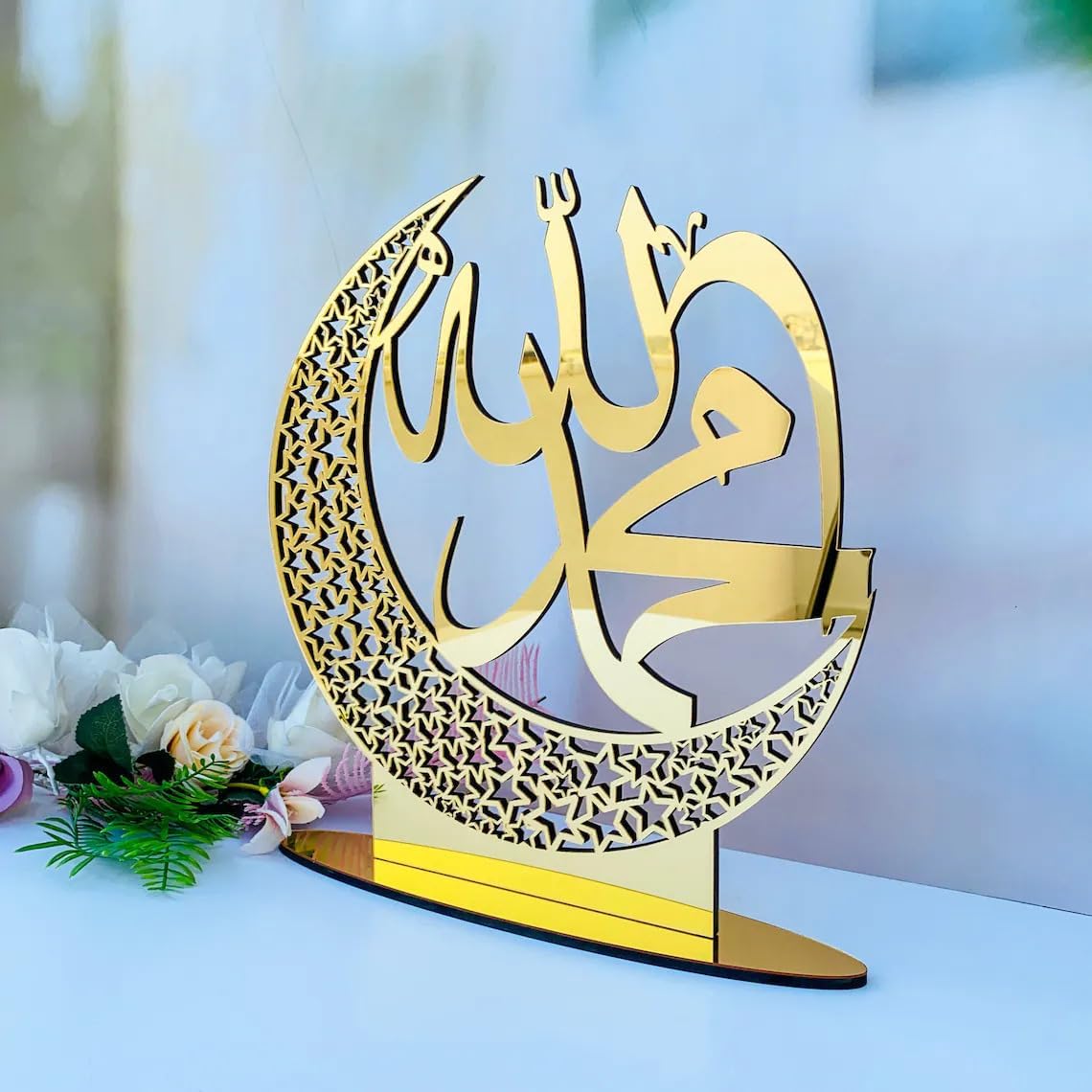 Islamic Table Decor – Allah & Muhammad Name Wooden MDF Art | Ramadan Eid Mubarak Gift | Muslim Tabletop