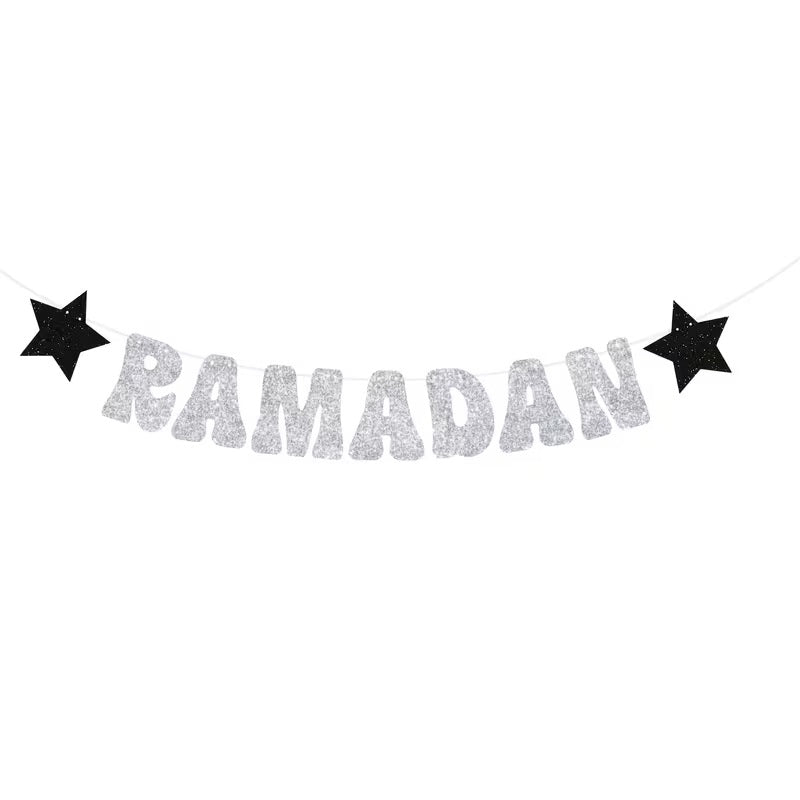 Ramadan Mubarak Paper Banner Set | Silver Glitter Finish Paper Hanging Decoration | 1 Set Islamic Eid Al-Fitr Party Decor for Home, Mosque & Iftar | Letter 5.91 Inch