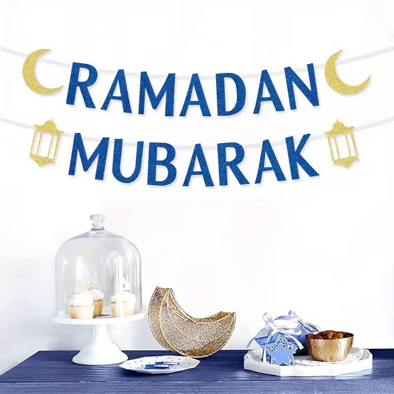 Ramadan Mubarak Paper Banner with Glitter Moon & Lantern | Islamic Eid al-Fitr & Ramadan Party Decorations | English Text Hanging Banner for Muslim Home, Mosque & Iftar | Letter Height 5.91 Inch (Bule)