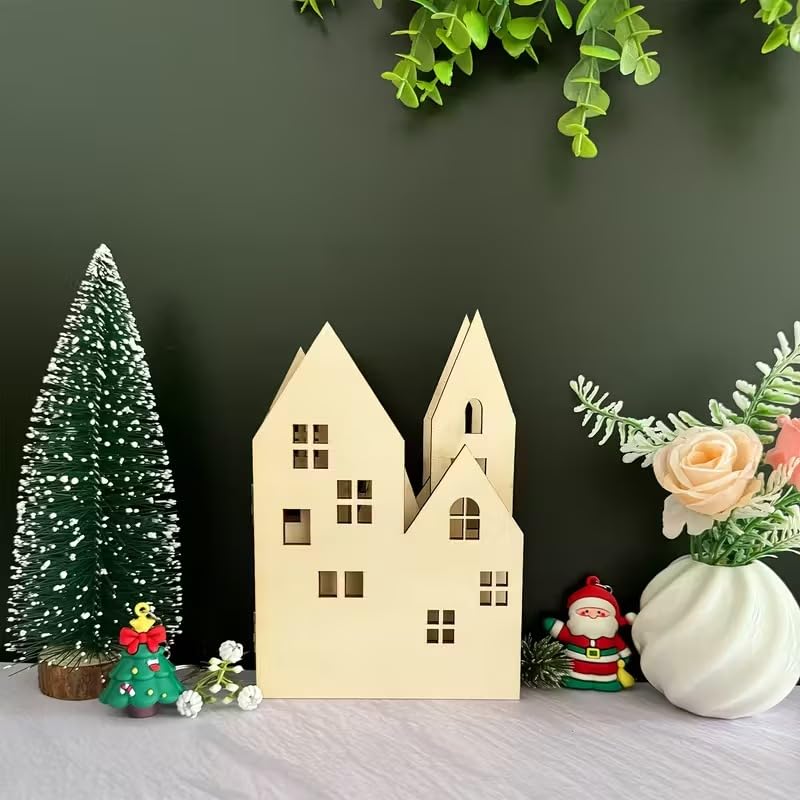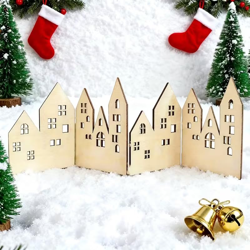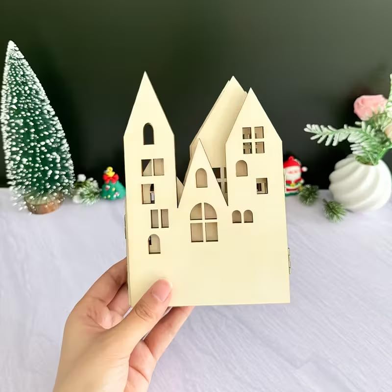 Create a magical Christmas atmosphere with this DIY Foldable Fairy Tale Town Building Set, inspired by classic European village and log cabin designs. Crafted from premium Pine MDF with a uniform 3mm thickness, it features smooth rounded edges and durable hinged joints, allowing you to fold or expand the miniature town as you like.