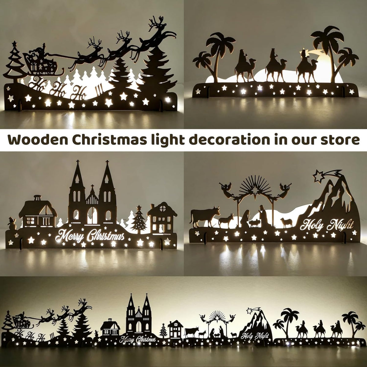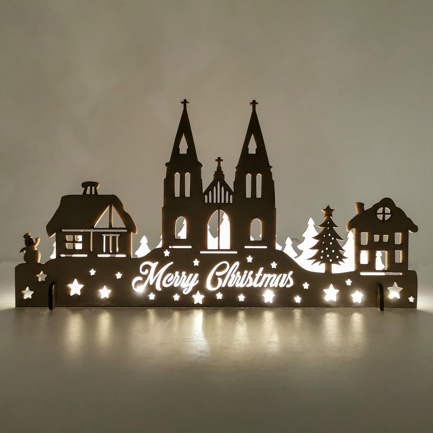 Transform your home into a magical winter wonderland with this Pine Wood Christmas Village Scene. Expertly crafted from high-quality pine wood, this elegant decoration showcases a beautiful winter town complete with houses, a cathedral, snowy trees, and festive stars. enhances every detail, creating a cozy and enchanting holiday glow. Designed in a compact 11.8 x 6.15-inch size, this wooden village fits perfectly on your fireplace mantel, coffee table, window sill, dining table, or office desk. The natural wood finish adds a rustic, Scandinavian charm that blends effortlessly with any Christmas décor theme. Whether you're building your seasonal village collection or searching for a unique holiday gift, this illuminated Christmas town is a timeless piece you’ll enjoy year after year. Bring festive cheer and warm memories into your home with this beautiful handcrafted Christmas display.