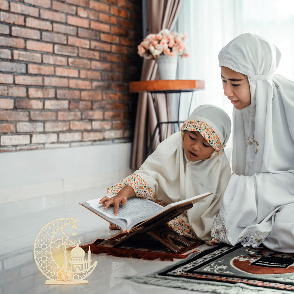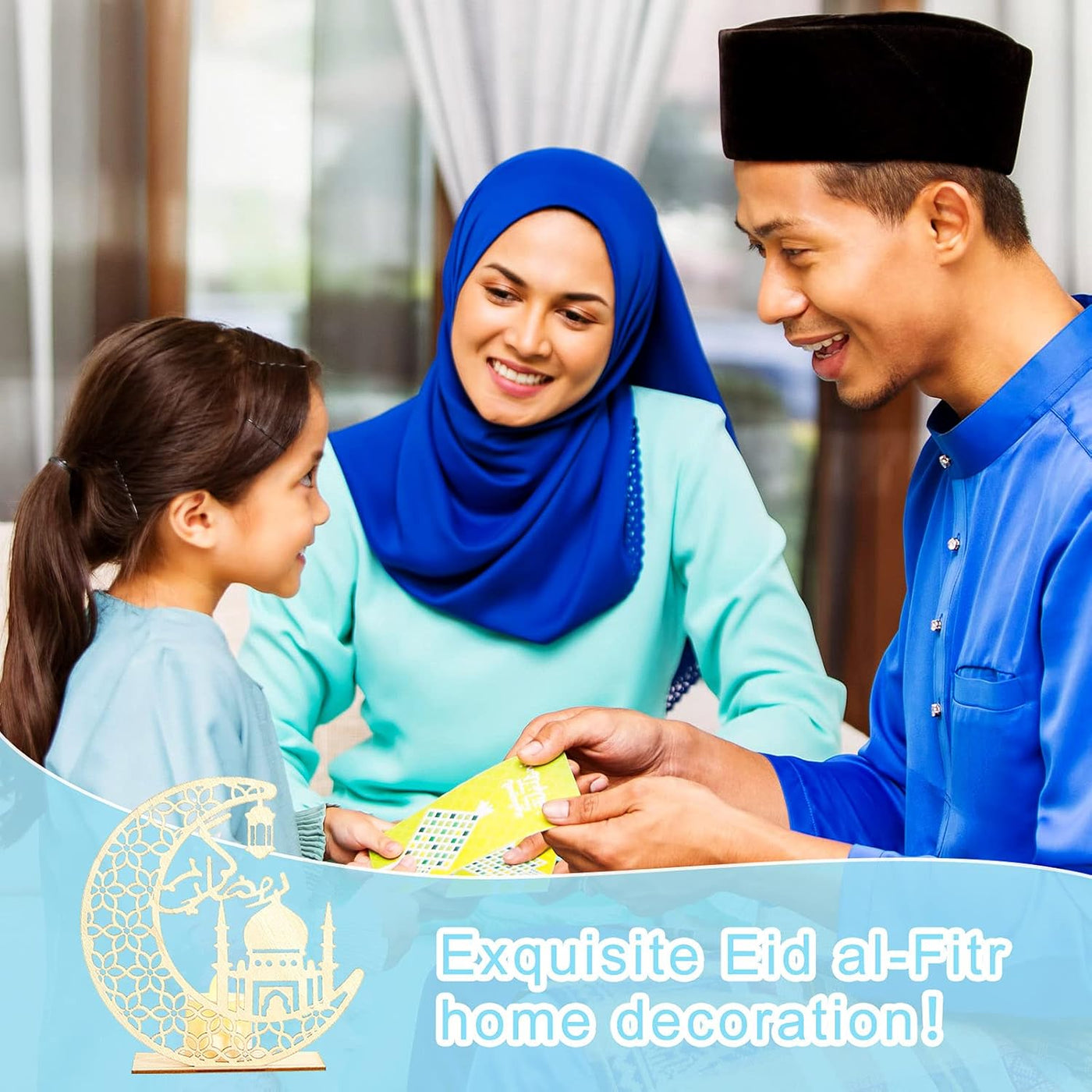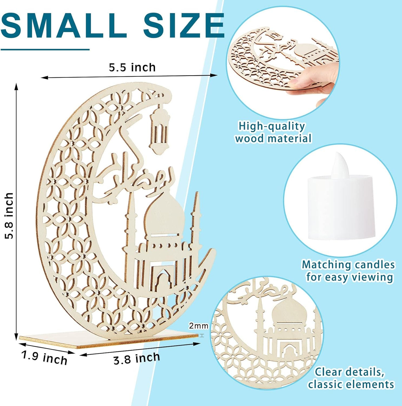 Eid Crafts Night Light Ramadan Mubarak Wooden Moon Lamp | Pine MDF Islamic Table Decor Light for Eid Al-Fitr Ramadan | Muslim Home Decoration Night Lamp | 5.8 x 5.5 Inch