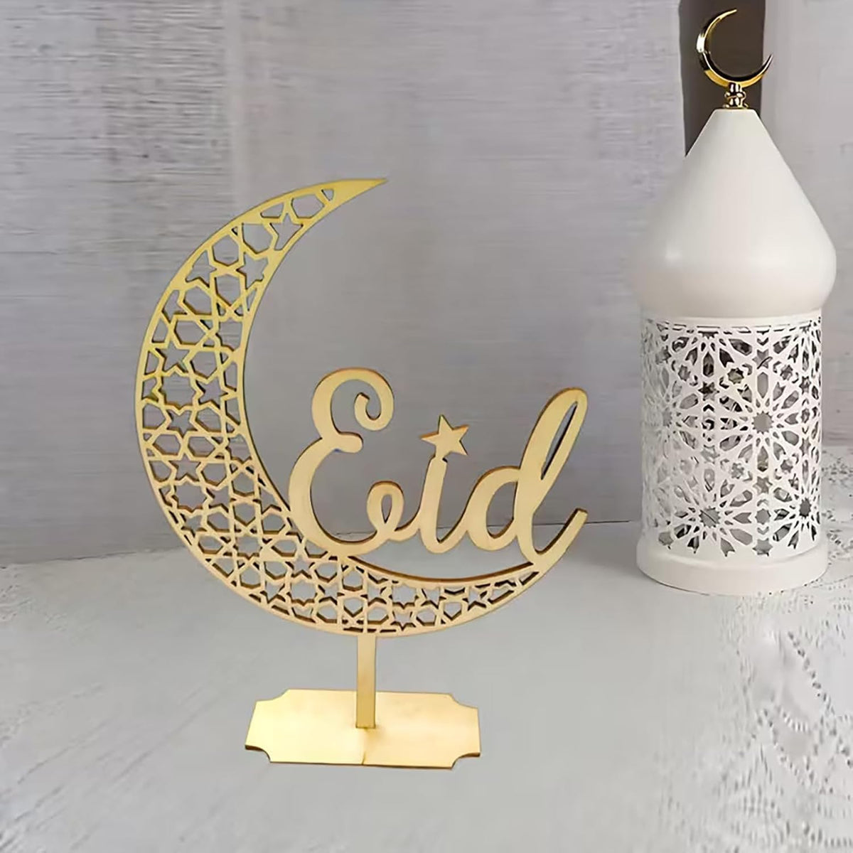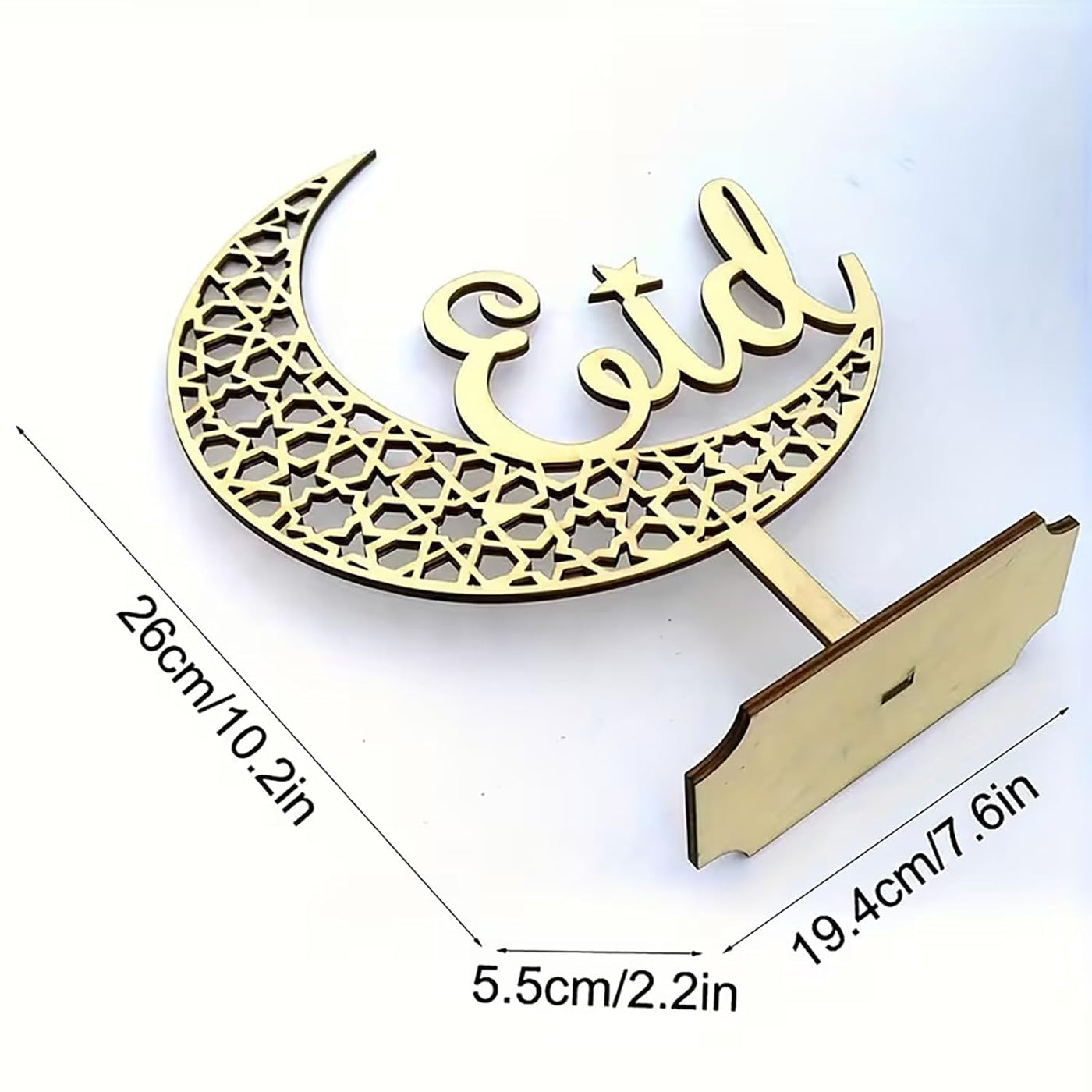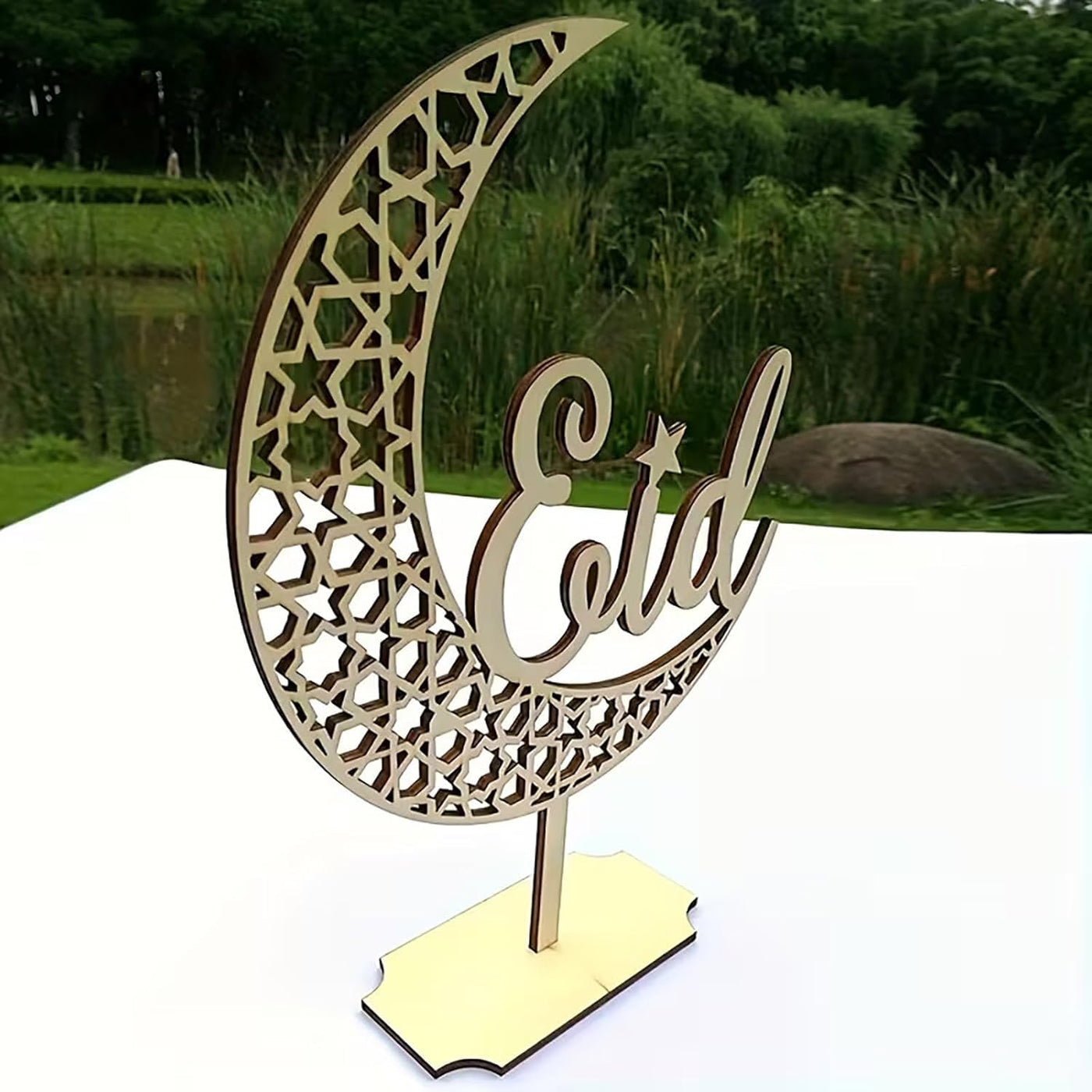 Eid Mubarak Wooden Crescent Moon Table Decor | Islamic Ramadan Eid al-Fitr Centerpiece | Freestanding Arabic Calligraphy Desktop Decoration